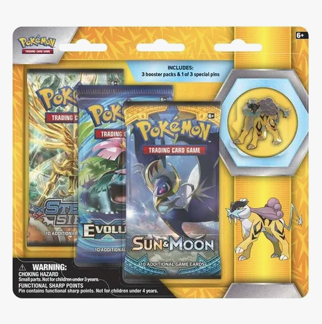 Card Text: Each blister comes with 3 booster packs, a coin, and a collectible pin of Raikou!