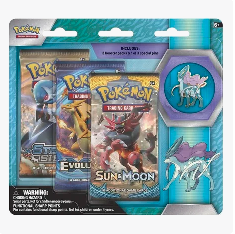 Card Text: Each blister comes with 3 booster packs, a coin, and a collectible pin of Suicune!